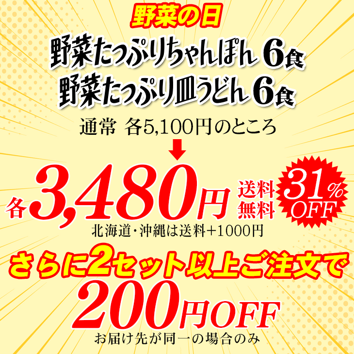 野菜たっぷり皿うどん 内容量 334g(具212g、めん67g、スープ45g、ドレッシング10g)×6食 原材料 具[野菜(キャベツ(国産)、玉ねぎ、にんじん、いんげん、コーン)、揚げかまぼこ、味付豚肉(豚肉、香辛料、食塩、植物油脂、ポークエキス、ポークオイル)、はんぺん、えび/増粘剤(加工でん粉)、調味料(アミノ酸)、ベニコウジ色素、焼成カルシウム]