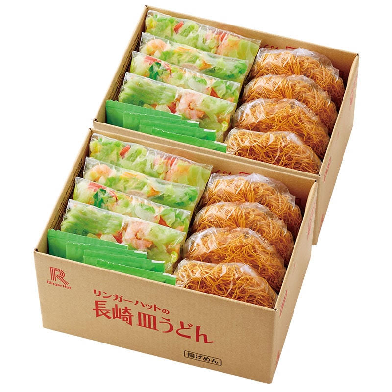 名称 皿うどん 内容 冷凍フライ麺・具・スープ各8個 内容量 244g(具132g/めん67g/スープ45g)×8食 箱サイズ 274mm×154mm×135mm ×2箱 保存方法 -18℃以下で保管してください。 賞味期限 製造日より366日
