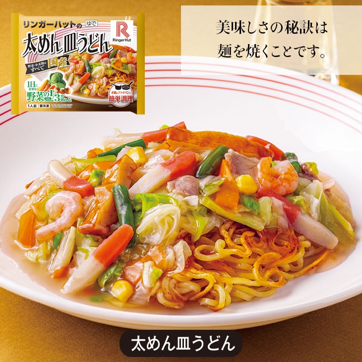 太めん皿うどん 内容量 331g(めん150g)×3食 原材料 めん [小麦粉(国内製造)、粉末状植物性たん白/加工でん粉、かんすい、クチナシ色素]