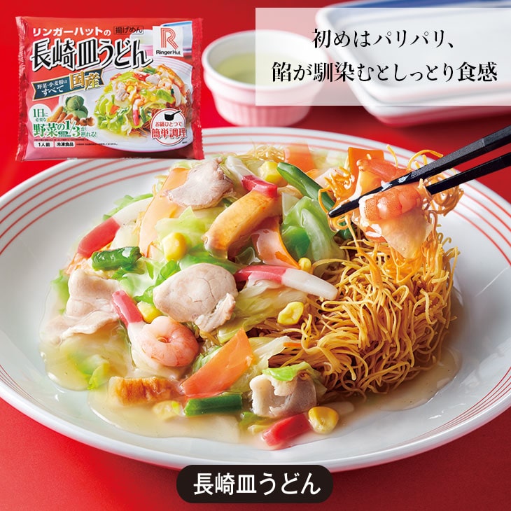 長崎皿うどん 内容量 244g(具132g/めん67g/スープ45g)×2食 原材料 具[野菜(キャベツ(国産)、玉ねぎ、にんじん、いんげん、コーン)、揚げかまぼこ、味付豚肉(豚肉、香辛料、食塩、植物油脂、ポークエキス、ポークオイル)、はんぺん、えび/増粘剤(加工でん粉)、調味料(アミノ酸)、ベニコウジ色素、焼成カルシウム]