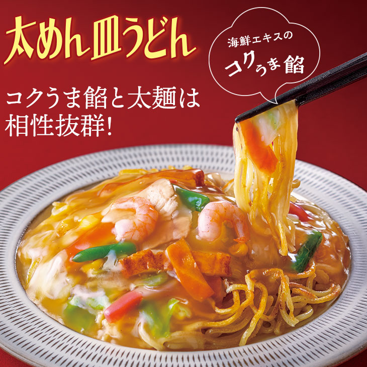太めん皿うどん 内容量 331g(めん150g) 原材料 めん [小麦粉(国内製造)、粉末状植物性たん白/加工でん粉、かんすい、クチナシ色素]