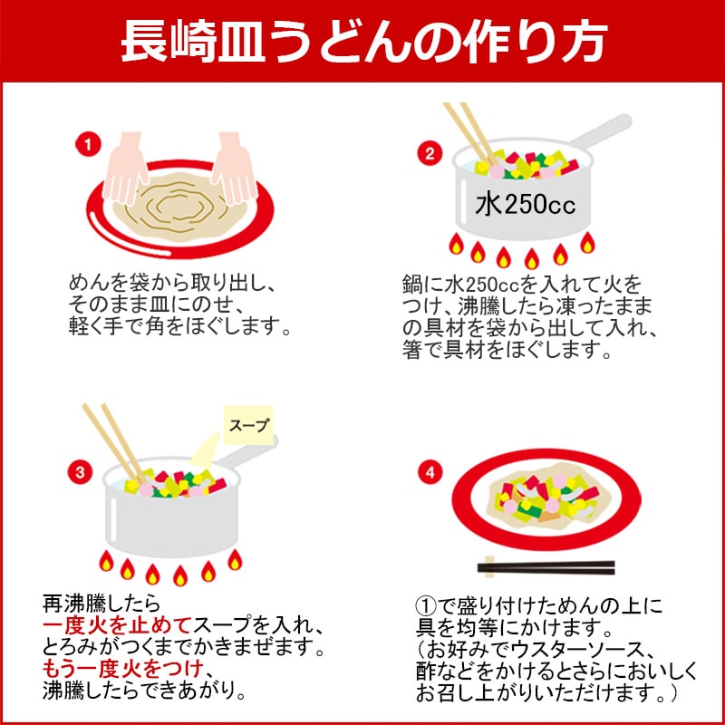 長崎皿うどん 内容量 244g(具132g/めん67g/スープ45g) 原材料 具[野菜(キャベツ(国産)、玉ねぎ、にんじん、いんげん、コーン)、揚げかまぼこ、味付豚肉(豚肉、香辛料、食塩、植物油脂、ポークエキス、ポークオイル)、はんぺん、えび/増粘剤(加工でん粉)、調味料(アミノ酸)、ベニコウジ色素、焼成カルシウム]