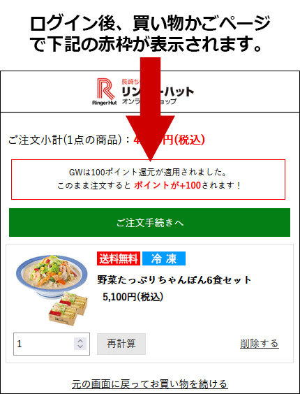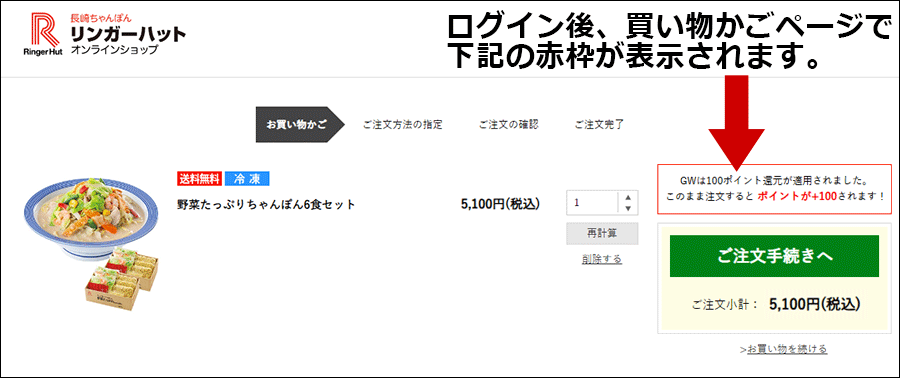 下記のようにお買い物カゴページで「GWは+100ポイント還元が適用されました。」と表示されていることをご確認してください。【PCの場合】